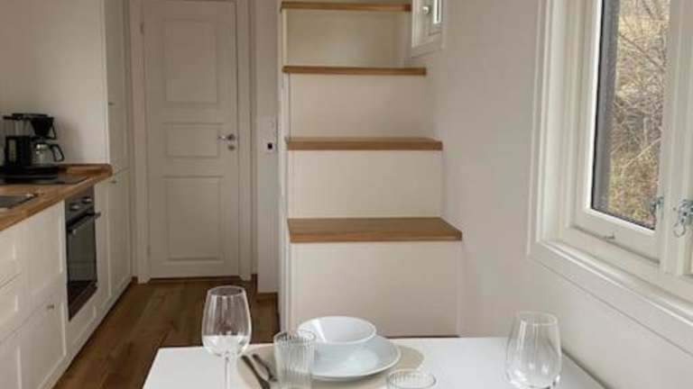 Das Apartment im Moderne minihus ved havet verfügt über ein geräumiges Schlafzimmer und eine Terrasse, von der aus Sie einen wunderschönen Blick auf die Stadt und das Meer genießen können. Die gut ausgestattete Küche bietet alles, was Sie für die Zubereitung Ihrer Mahlzeiten benötigen, einschließlich eines Kühlschranks, eines Geschirrspülers, eines Backofens und eines Haartrockners.