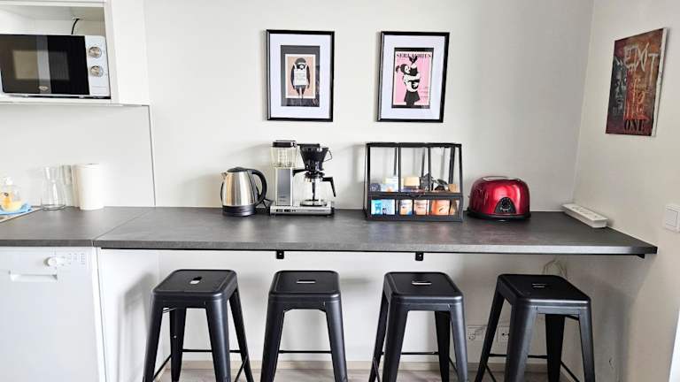 Die Ferienwohnung umfasst 1 Schlafzimmer, 1 Badezimmer sowie eine voll ausgestattete Küche. Zur Ausstattung gehören Bettwäsche, Handtücher, ein Flachbild-TV mit Kabelkanälen und eine Klimaanlage. Das Zimmer ist schallisoliert und bietet kostenfreies WLAN. Ein Babybett kann für Kinder bis 3 Jahren gegen Gebühr bereitgestellt werden.
