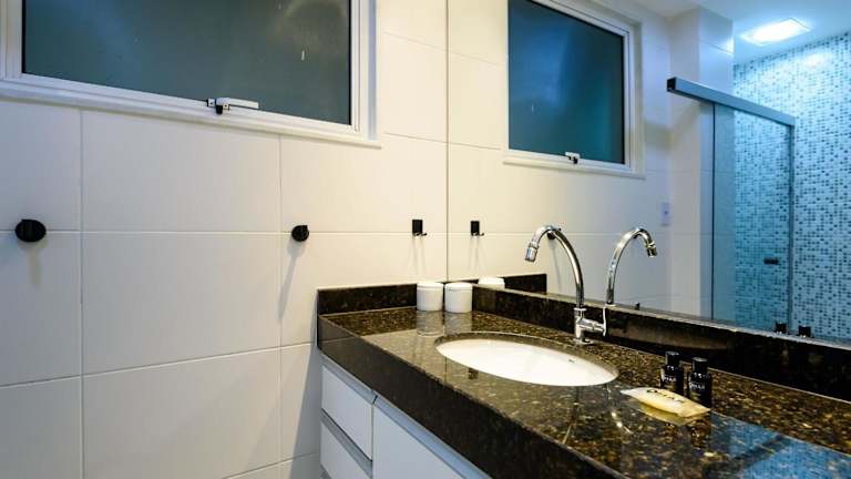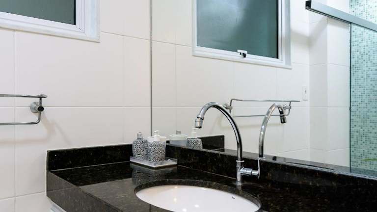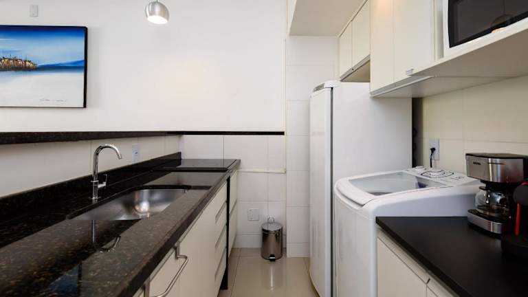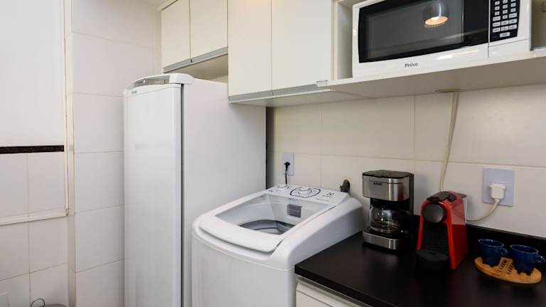 Das Apartment im Omar do Rio - SL 214 Moderno Studio bietet ein komfortables Schlafzimmer, Kabel-TV und eine voll ausgestattete Küche mit Kühlschrank und Mikrowelle. Eine Waschmaschine und ein Badezimmer mit Dusche sind ebenfalls vorhanden. Die Unterkunft ist mit kostenfreiem WLAN und Klimaanlage ausgestattet, um Ihnen einen angenehmen Aufenthalt zu ermöglichen.