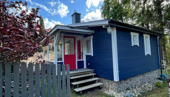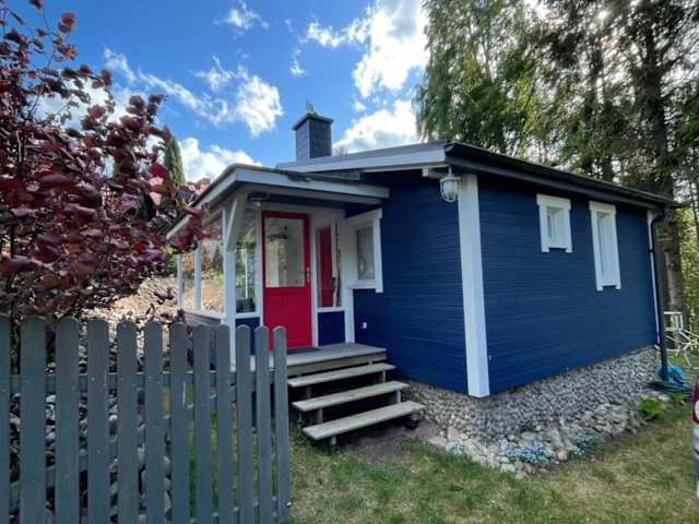 Modry Domek Sznurki Całoroczny Ogrodzony bietet Übernachtungsmöglichkeiten in einem Ferienhaus mit einem Garten, kostenlosem WLAN und einer Gemeinschaftsküche. Die Unterkunft verfügt über einen kostenlosen Privatparkplatz und eine Terrasse.