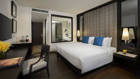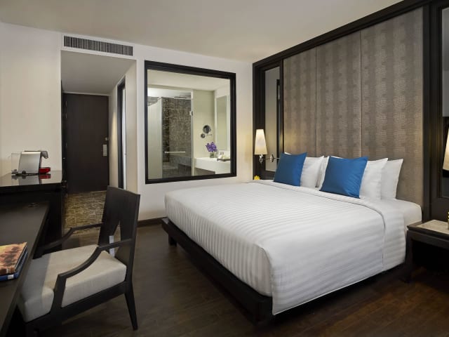 Die stilvollen Superior Zimmer (ca. 30 qm) sind im asiatischen Design eingerichtet und verfügen über eine Regendusche, WC, Föhn, digital regelbare Klimaanlage, Safe, Minibar, Wecker, Kaffee-/Teezubereiter, Telefon, Bügeleisen und Bügelbrett, Schreibtisch und 46-Zoll-LED-Flachbild-TV. Die Deluxe Zimmer (ca. 32 qm) liegen in den höheren Etagen und haben zusätzlich eine Badewanne. Einen noch besseren Ausblick bieten die Executive Zimmer (ca. 32 qm). Diese sind zusätzlich mit einer Kaffeemaschine ausgestattet und bieten Zugang zur Executive-Lounge mit verschiedenen Extras ohne Aufpreis, wie Z.B. Frühstück in der Lounge und ein täglicher 2-stündiger Abend Cocktail. Noch geräumiger und besser ausgestattet sind die Executive Suiten (ca. 60 qm) mit Panoramaaussicht. Sie verfügen zusätzlich über eine Mikrowelle, begehbaren Kleiderschrank und einen separaten Wohn-/Schlafraum und teilweise über einen kleinen Balkon.