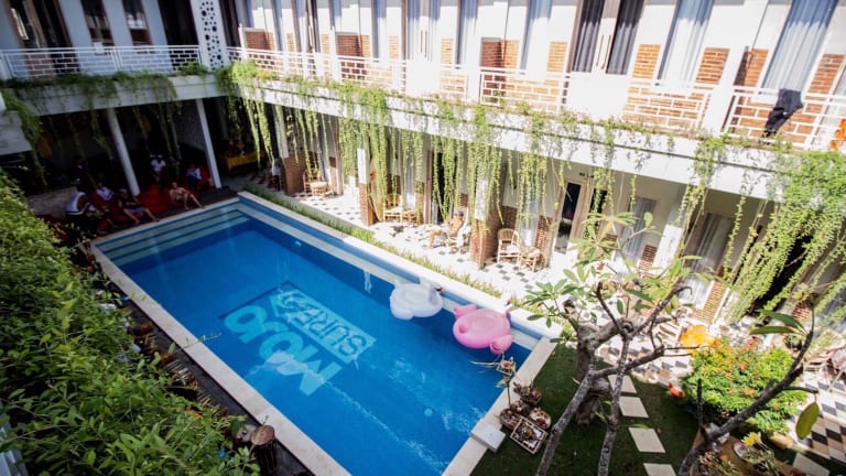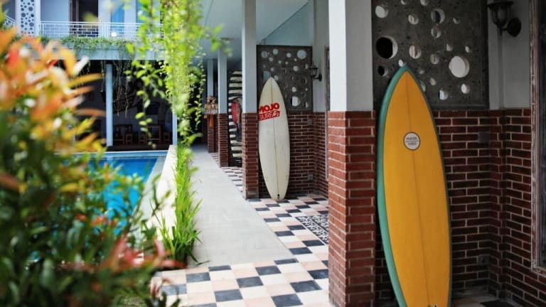 Das Mojosurf Camp Canggu in Canggu ist die ideale Unterkunft für Reisende, die nach einer entspannten und unterhaltsamen Zeit suchen. Mit kostenfreiem WLAN, einem Außenpool und einer Terrasse bietet das Hostel alles, was Sie für einen angenehmen Aufenthalt benötigen. Genießen Sie eine Mahlzeit im Restaurant oder entspannen Sie an der Bar. Die Zimmer sind komfortabel und einige bieten einen Balkon mit Pool- oder Gartenblick. Freuen Sie sich auf Aktivitäten wie Wassersport, Wandern, Radfahren und Reiten in der Umgebung. Der Strand Echo Beach und der Strand Batu Bolong Beach sind nur einen kurzen Spaziergang entfernt.