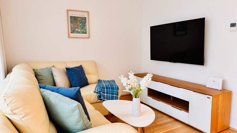 Die Ferienwohnung ist mit einem Schlafzimmer, einer voll ausgestatteten Küche mit Kühlschrank und Geschirrspüler, einem Flachbild-TV, einem Sitzbereich sowie einem Badezimmer mit Dusche ausgestattet. Handtücher und Bettwäsche werden bereitgestellt.