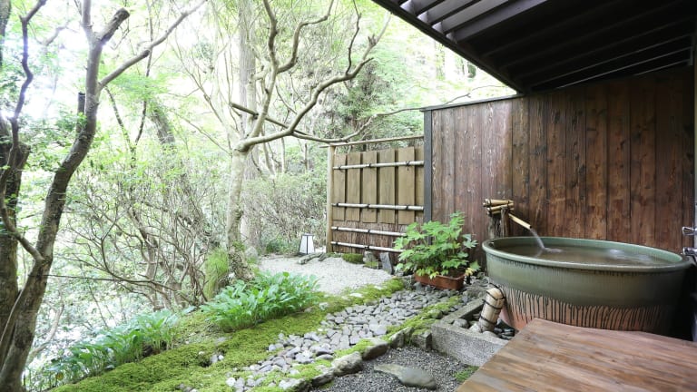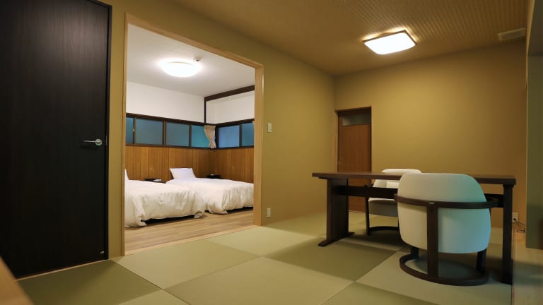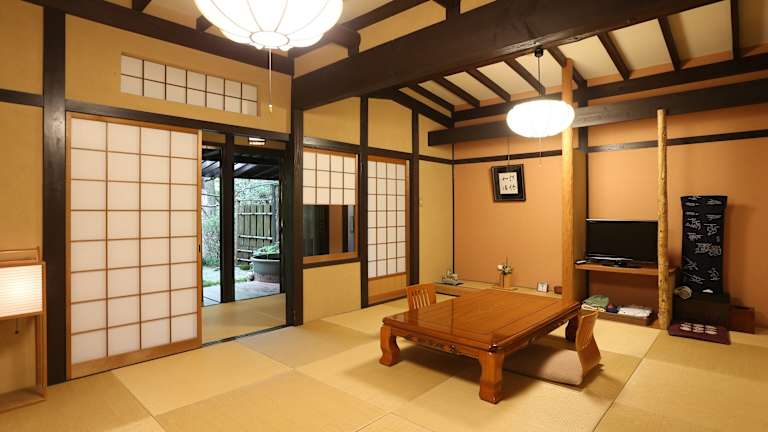Die traditionellen Zimmer im Momijiya Annex bieten eine authentische Atmosphäre mit Tatami-Matten und Papierschiebetüren. Jedes Zimmer verfügt über ein eigenes Bad im Freien, in dem Sie die Natur genießen können. Ein Sitzbereich, ein TV und ein Kühlschrank sind ebenfalls vorhanden. Die Zimmer bieten einen gemütlichen Rückzugsort nach einem langen Tag voller Erkundungen.