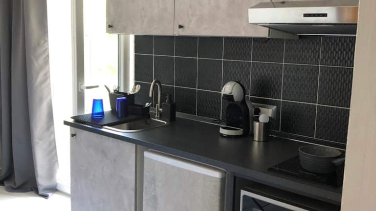 Die Ferienwohnung besteht aus einem Schlafzimmer und einem Badezimmer. Zur Ausstattung gehören Bettwäsche, Handtücher, ein Flachbild-TV mit Kabelkanälen, eine voll ausgestattete Küche sowie ein Balkon mit Meerblick.
