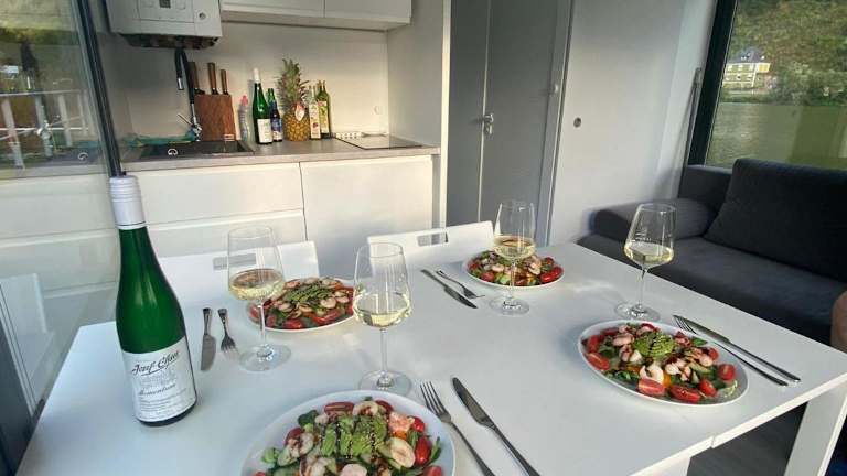 Das Boot umfasst zwei Schlafzimmer, ein Wohnzimmer, ein Badezimmer mit Dusche sowie eine voll ausgestattete Küche mit Kühlschrank und Herdplatte. Zur Ausstattung gehören ein Flachbild-TV, Kaffeemaschine, Handtücher, Bettwäsche und Wäsche, die gemäß den Richtlinien der örtlichen Behörden gereinigt werden.
