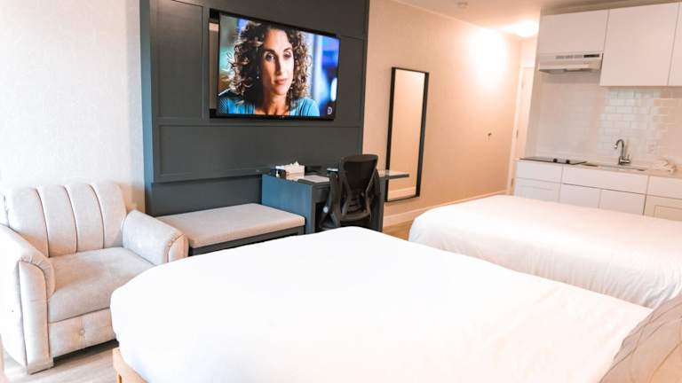 Die klimatisierten Zimmer sind ausgestattet mit einem Schreibtisch, einer Kaffeemaschine, einem Kühlschrank, einer Mikrowelle, einem Safe, einem Flachbild-TV, einem Balkon und einem eigenen Badezimmer mit einer Dusche. Ausgewählte Zimmer verfügen zusätzlich über eine Küche mit einer Herdplatte und einem Toaster.