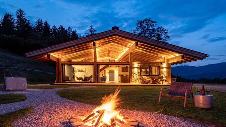 Das Chalet umfasst zwei Schlafzimmer, ein Wohnzimmer und eine gut ausgestattete Küche mit Kühlschrank und Geschirrspüler. Handtücher und Bettwäsche werden bereitgestellt.