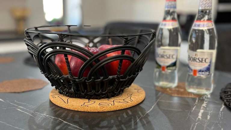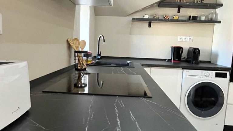 Die Ferienwohnung beinhaltet eine voll ausgestattete Küche mit einem Kühlschrank und einer Kaffeemaschine, die Selbstversorgeroptionen ermöglicht. Es sind keine weiteren Verpflegungsmöglichkeiten angegeben.