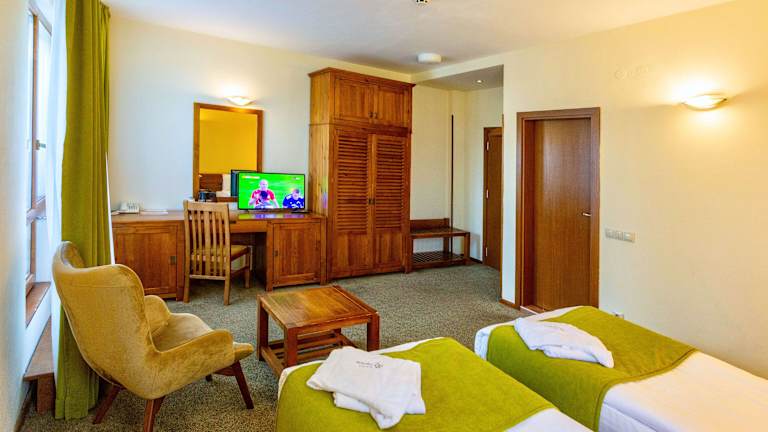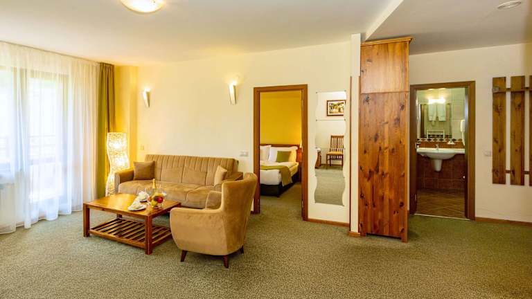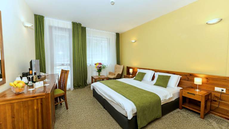 Die Zimmer sind komfortabel eingerichtet und verfügen über einen Balkon oder eine Terrasse mit Blick auf die Berge oder das Resort. Zur Standardausstattung zählen ein Queensizebett, ein Sofabett, ein Safe, eine Minibar und ein Kühlschrank. Das Badezimmer ist mit einer Dusche, einem Haartrockner und Bademänteln ausgestattet. Es stehen Familien- und Nichtraucherzimmer zur Verfügung.