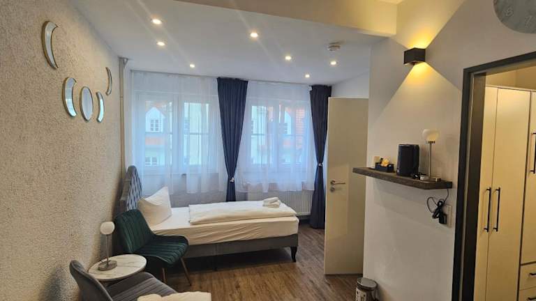 Die Unterkunft befindet sich in Füssen, in der Nähe von Kloster St. Mang, und bietet einen Stadtblick. Sie ist nur 200 m von der Staatsgalerie im Hohen Schloss entfernt und etwa 5,1 km vom Schloss Neuschwanstein. Das Stadtzentrum ist weniger als 100 m entfernt, ebenso das Museum der Stadt Füssen. Weitere Entfernungen sind 16 km zum Bahnhof Reutte in Tirol, 36 km zum Bahnhof Lermoos und 44 km zum Fernpass. Der Flughafen Memmingen liegt 76 km entfernt.