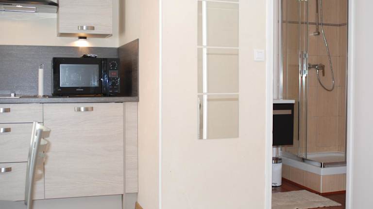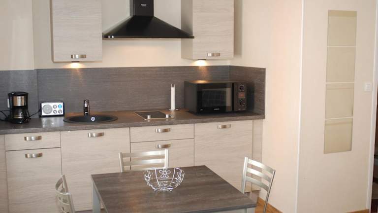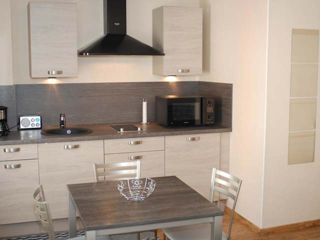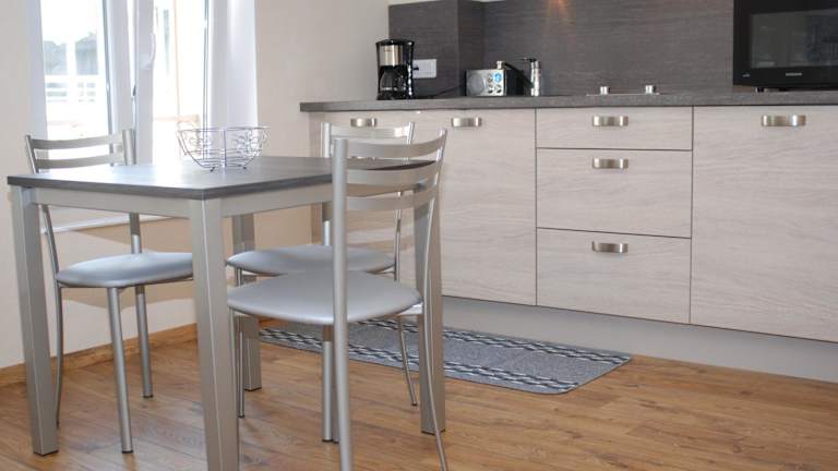 Die Ferienwohnung ist mit einer Küche ausgestattet, die einen Kühlschrank, einen Ofen, eine Mikrowelle, eine Kaffeemaschine sowie einen Wasserkocher umfasst. Es gibt keine weiteren Informationen zu Verpflegungsmöglichkeiten.
