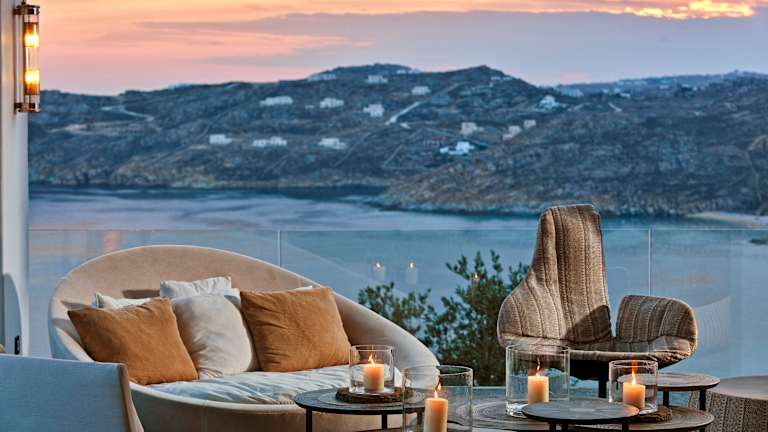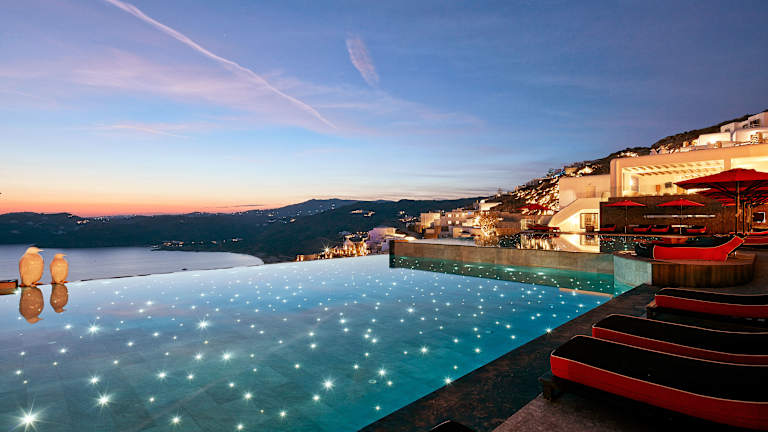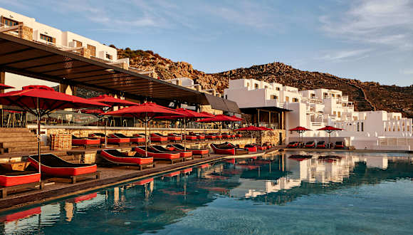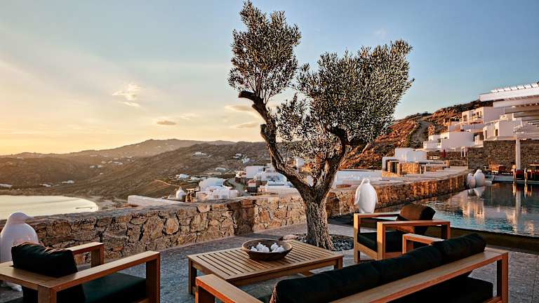 Das Myconian Avaton Resort ist ein luxuriöses Hotel, das 200 Meter über dem Ägäischen Meer thront. Das Resort fügt sich nahtlos in die umgebende Natur ein und bietet eine harmonische Atmosphäre gepaart mit Privatsphäre und modernem Komfort. Das Hotel gehört zur Design Hotels Kollektion und bietet eine Vielzahl von Annehmlichkeiten, darunter zwei Außenpools, ein Thalassotherapie-Wellnesscenter sowie ein reichhaltiges Angebot an gastronomischen Optionen.