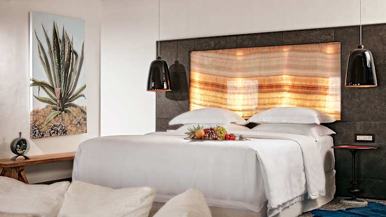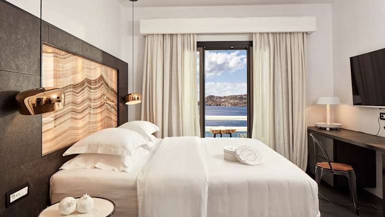 Die Zimmer im Myconian Avaton Resort sind im typischen Kykladenstil mit modernen Elementen eingerichtet. Die Ausstattung umfasst Klimaanlage, Flachbild-Sat-TV, iPod-Dockingstation, Minibar sowie luxuriöse Badezimmer mit kostenfreien Pflegeprodukten, Bademänteln und Hausschuhen. Die Zimmer bieten zudem einen Balkon oder eine Terrasse mit Blick auf das Meer.