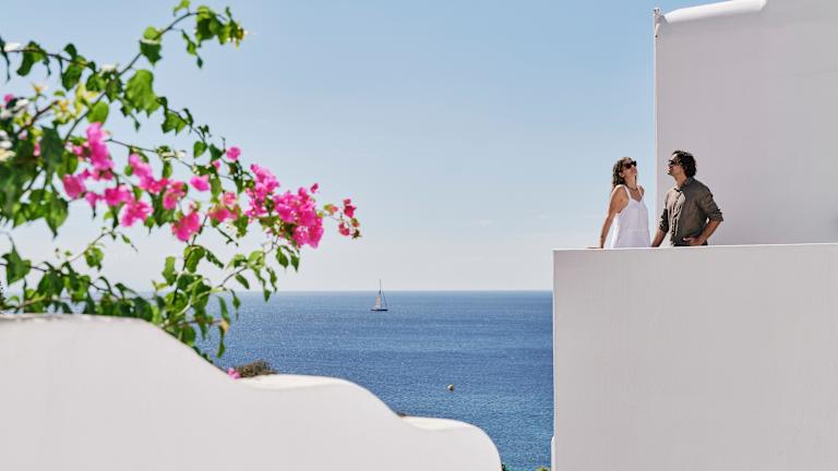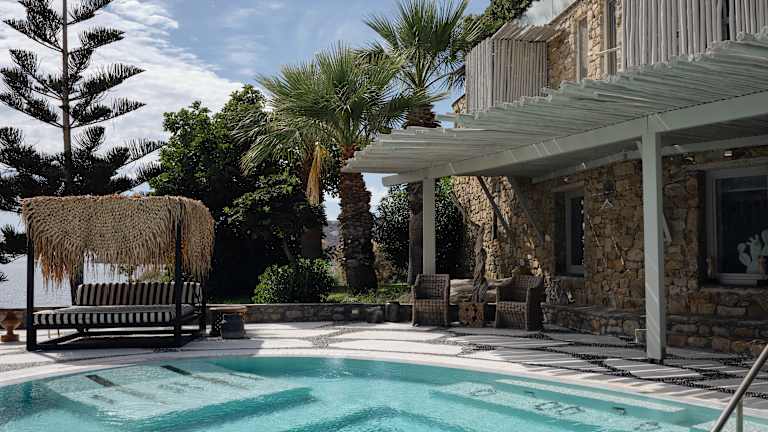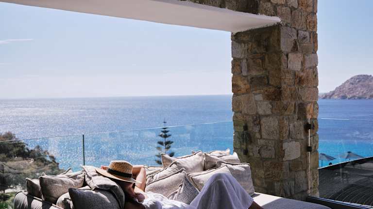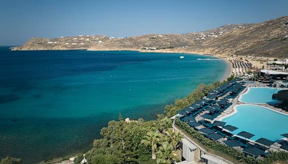 Das Hotel befindet sich oberhalb von Elia, dem längsten Strand der Insel Mykonos, bekannt für seine aquamarinfarbenen Gewässer und den feinen Sand. Es liegt an der Südküste, etwa 20 Minuten mit dem Hotelshuttle von Mykonos Stadt entfernt. Gäste können das legendenhafte Nachtleben in Cavo Paradiso oder Super Paradise in kurzer Zeit erreichen. Ein Shuttleservice bringt die Gäste fast stündlich zur Stadt und zurück, zudem sind Wassertaxis verfügbar.