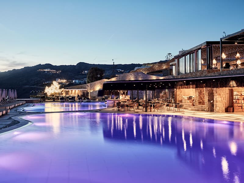 Das Hotel befindet sich oberhalb von Elia, dem längsten Strand der Insel Mykonos, bekannt für seine aquamarinfarbenen Gewässer und den feinen Sand. Es liegt an der Südküste, etwa 20 Minuten mit dem Hotelshuttle von Mykonos Stadt entfernt. Gäste können das legendenhafte Nachtleben in Cavo Paradiso oder Super Paradise in kurzer Zeit erreichen. Ein Shuttleservice bringt die Gäste fast stündlich zur Stadt und zurück, zudem sind Wassertaxis verfügbar.