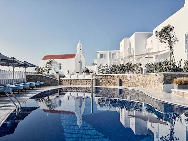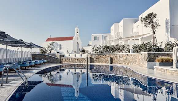 Das Hotel befindet sich in erhabener Lage auf einem Hügel und bietet einen atemberaubenden Blick über die Ägäis. Die Nähe zu Mykonos-Stadt mit ihren vielen Gassen, Bars und Restaurants erlaubt es Gästen, das pulsierende Leben zu genießen oder die beeindruckenden Sonnenuntergänge vom Hotel aus zu beobachten. Der Strand Psarrou ist ca. 2 km entfernt und das Stadtzentrum von Chora liegt ca. 400 m entfernt.