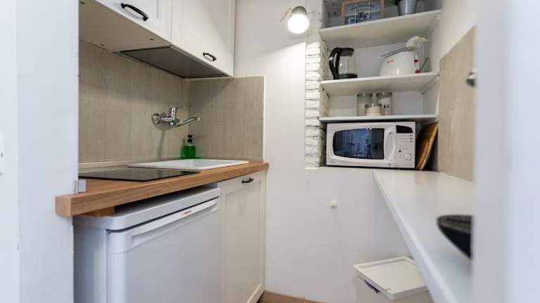 Die Ferienwohnung verfügt über 1 Schlafzimmer, ein Wohnzimmer und eine voll ausgestattete Küchenzeile mit Kühlschrank und Kaffeemaschine. Zudem sind ein Badezimmer mit Bidet und Dusche vorhanden. Handtücher und Bettwäsche werden bereitgestellt.