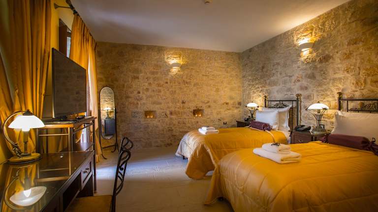 Die Zimmer im Mystras Grand Palace Resort & Spa sind klimatisiert und verfügen über ein eigenes Bad mit Dusche, Haartrockner und weiteren Annehmlichkeiten. Alle Zimmer bieten eine Terrasse, einige sogar mit Bergblick. Zur Ausstattung gehören ein Kingsizebett, ein Sofabett, ein Safe, eine Minibar und ein Kühlschrank. Des Weiteren stehen ein Telefon, Sat-TV und kostenloses WLAN zur Verfügung. Rollstuhlgerechte Zimmer mit barrierefreiem Bad sind ebenfalls verfügbar. Familien- und Nichtraucherzimmer sind bereitgestellt.