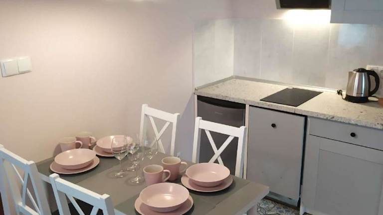 Einige Wohneinheiten sind mit einer Küchenzeile ausgestattet, die einen Kühlschrank, einen Geschirrspüler und eine Herdplatte umfasst.