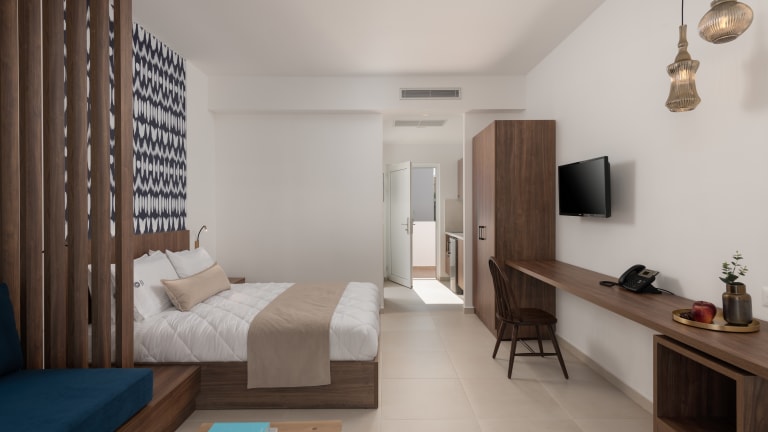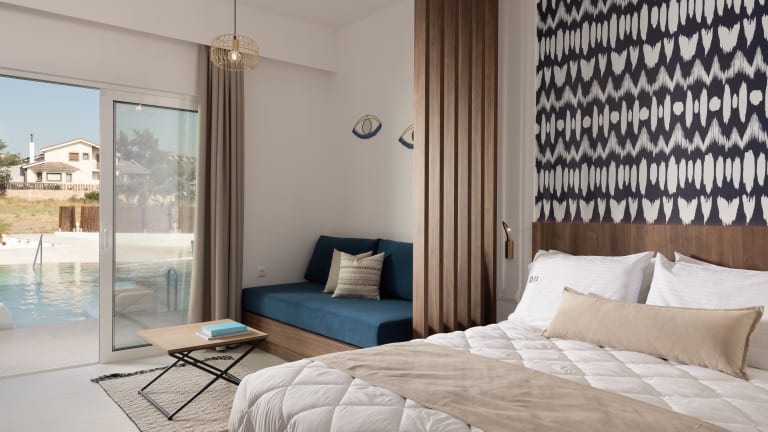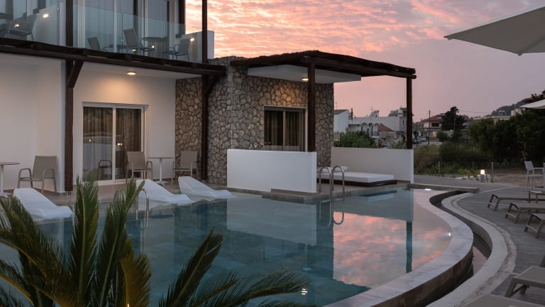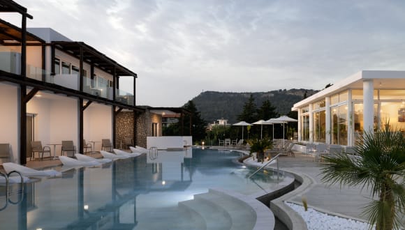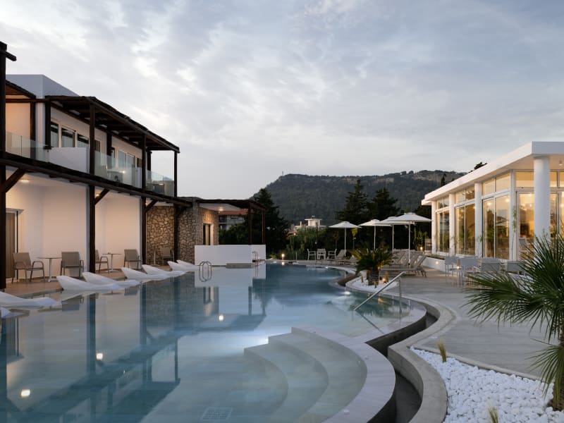 Standard Suite: Luxury at its finest on the 1st floor, with 32 m2 of space. A private balcony designed for total relaxation and privacy with a view towards Filerimos hill and the cool waters of the swimming pool. Discreet luxury and all the modern amenities offer guests a memorable experience of authentic hospitality. The Standard Suites are decorated in a minimalist style, they feature a queen-size bed and a sofa The modern bath has a shower enclosure and personal hygiene products for every guest. Swim Up Suite: The ground floor Swim-up Suites combine minimal aesthetic with Greek architectural details. The open sitting room-bedroom welcomes you with a queen-size bed and a sofa. The modern bath has a spacious shower enclosure, hair dryer, bathrobes and personal care products. At the Swim-up Suites, your sunbeds dip into the clean, cool waters of the pool. Enjoy the feeling of complete tranquillity Swim Up Suite (Accessible): The suites have been designed to provide the highest level of luxury while allowing our guests to experience a traditional boutique accommodation. Each room has its own private balcony with a view towards Filerimos and includes all the amenities to ensure independence and relaxation.