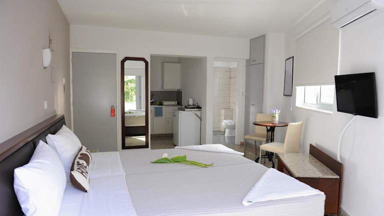 Jedes Apartment verfügt über ein eigenes Bad, einen Sitzbereich sowie eine Ausstattung mit Klimaanlage und Heizung. Die Küchenzeilen sind für die Selbstverpflegung optimiert und bieten die erforderlichen Utensilien. Die Unterkünfte sind schallisoliert und bieten einen kleinen Essbereich sowie einen Balkon.