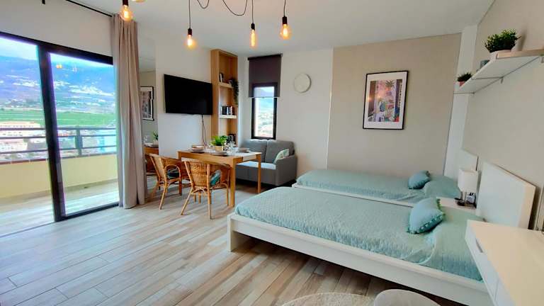 Die Ferienwohnung verfügt über ein Schlafzimmer und ein Badezimmer. Zur Ausstattung gehören Bettwäsche, Handtücher, ein Flachbild-TV mit Kabelkanälen, ein separater Essbereich sowie eine Terrasse mit Stadtblick. Zur weiteren Ausstattung gehören auch Nichtraucherzimmer und ein Außenpool.