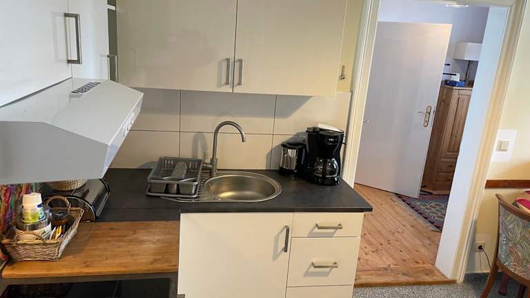 Die Ferienwohnung verfügt über ein Schlafzimmer, ein Wohnzimmer und eine voll ausgestattete Küche, die mit einem Kühlschrank und einer Mikrowelle ausgestattet ist.