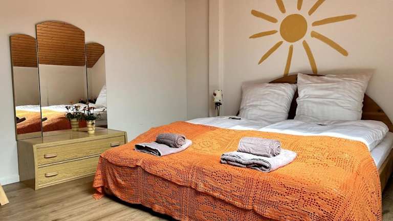 Die Ferienwohnung verfügt über ein Schlafzimmer, ein Badezimmer mit Dusche, ein Wohnzimmer, einen Essbereich und eine Küche, die mit einem Kühlschrank, einem Ofen und einer Herdplatte ausgestattet ist. Handtücher und Bettwäsche sind ebenfalls vorhanden.