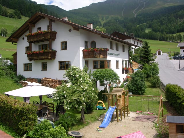 Wir bieten unseren Gästen 3 gemütliche Ferienwohnungen mit Balkon und Blick auf die umliegende Bergwelt und den Garten! Im Garten befindet sich der große Sans-Spielplatz mit Spielturm, Rutsche, Schaukeln und jeder Menge Spielsachen!