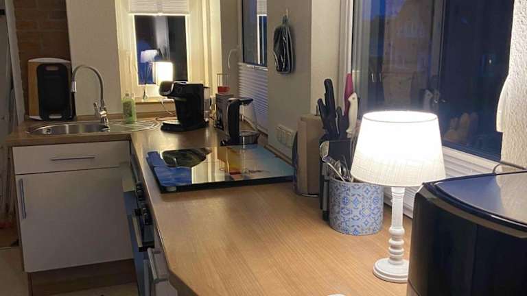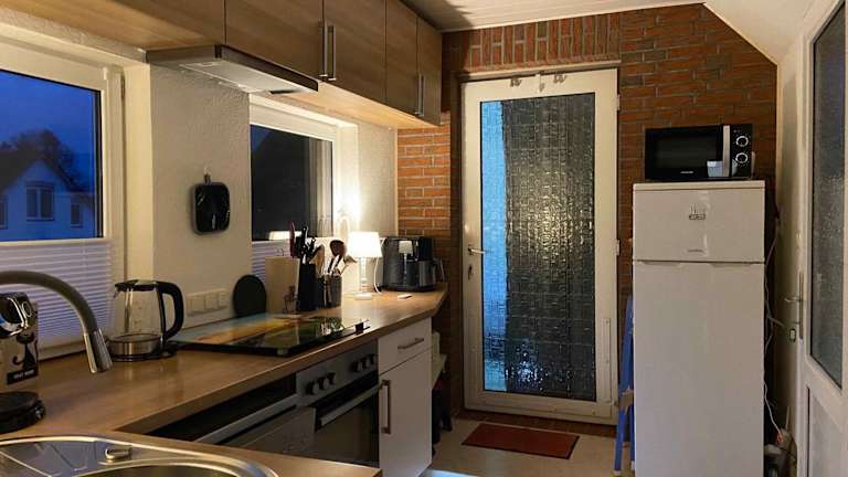 Die Küchenzeile der Unterkunft ist ausgestattet mit einem Kühlschrank, Geschirrspüler, Ofen, Kaffeemaschine und Wasserkocher, was den Gästen die Möglichkeit gibt, eigene Mahlzeiten zuzubereiten.