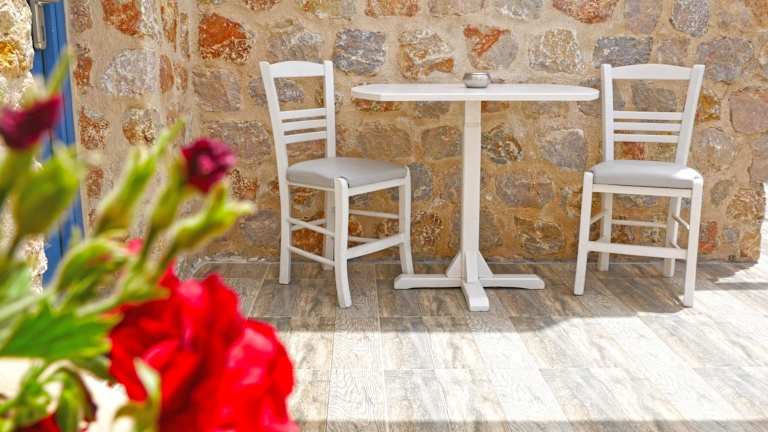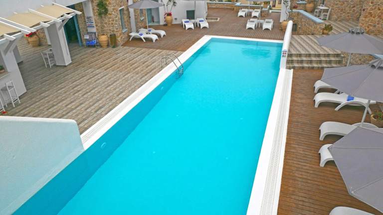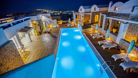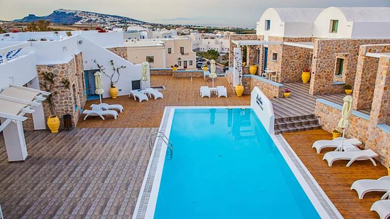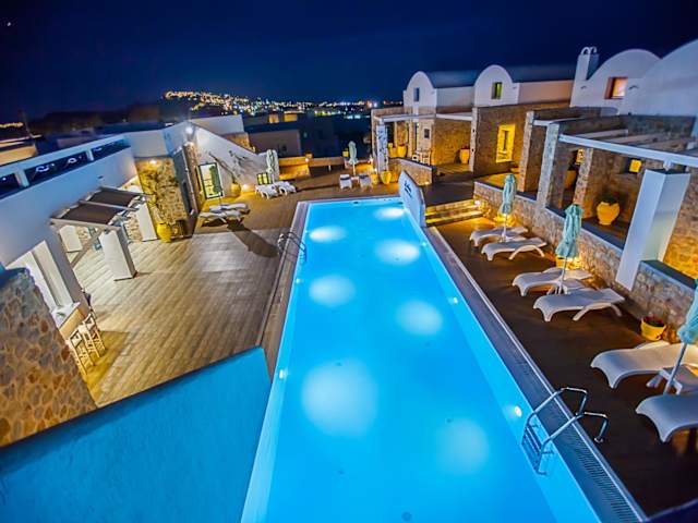 Entspannen Sie am Pool auf der Holzterrasse mit Liegestühlen und Sonnenschirmen und genießen Sie dabei den herrlichen Blick auf die Ägäis und den Vulkan. In der Umgebung finden Sie auch zahlreiche Tavernen, Bars und kleine Supermärkte, die Sie erkunden können. Der Strand Monolithos ist nur 5 km entfernt und der Strand Kamari erreichen Sie nach 8 km.