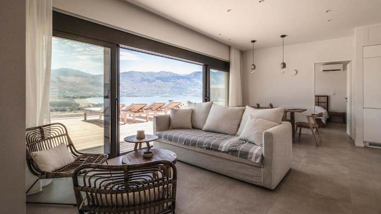 Die Unterkunft befindet sich in Pogoniá, in der Nähe der Festung Agia Mavra und weniger als 30 km vom Flughafen Aktion entfernt. Die Umgebung bietet eine malerische Berglandschaft.