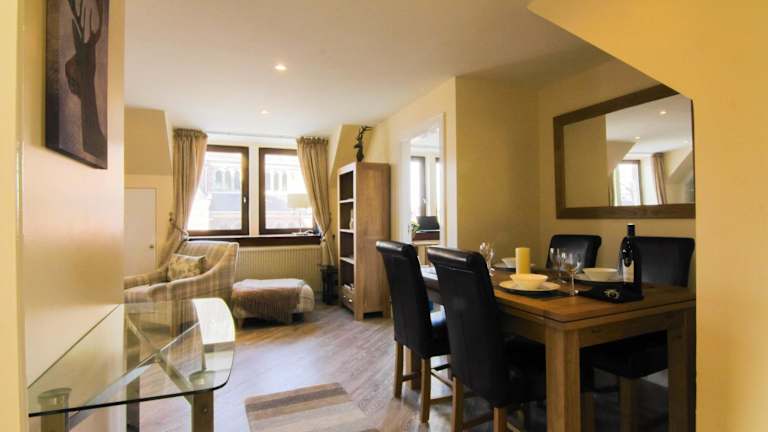 Das Ness View Apartment in Inverness bietet elegante Unterkünfte in einer idealen Lage. Nur wenige Gehminuten von der Burg Inverness Castle und den Ufern des Flusses Ness entfernt, können Gäste die Schönheit der Stadt bequem erkunden. Die Unterkunft selbst bietet kostenfreies WLAN und Parkplätze in der Nähe. Mit einem Schlafzimmer mit Kingsize-Bett, einem Zweibettzimmer und einem luxuriösen Badezimmer ist das Apartment ideal für Familien oder Gruppen von Freunden. Die Lounge mit hochwertigen Möbeln und Unterhaltungsmöglichkeiten sorgt für Entspannung und Unterhaltung. Die gut ausgestattete Küche bietet einen Flussblick und einen attraktiven Essbereich. In der Nähe finden Sie auch Sehenswürdigkeiten wie die Kathedrale von St. Andrews und das Eden Court Theatre. Das Ness View Apartment ist somit eine ideale Wahl für einen komfortablen und angenehmen Aufenthalt in Inverness.