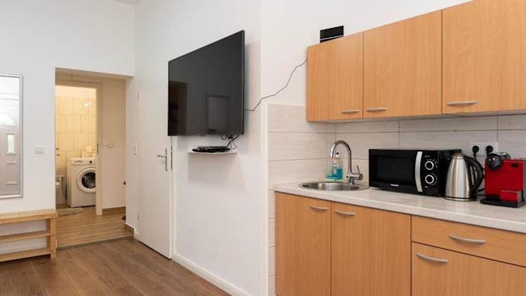 Die Unterkunft bietet eine voll ausgestattete Küche, die mit einem Kühlschrank und einer Kaffeemaschine ausgestattet ist. Es sind keine weiteren Informationen zu Verpflegungsmöglichkeiten vorhanden.
