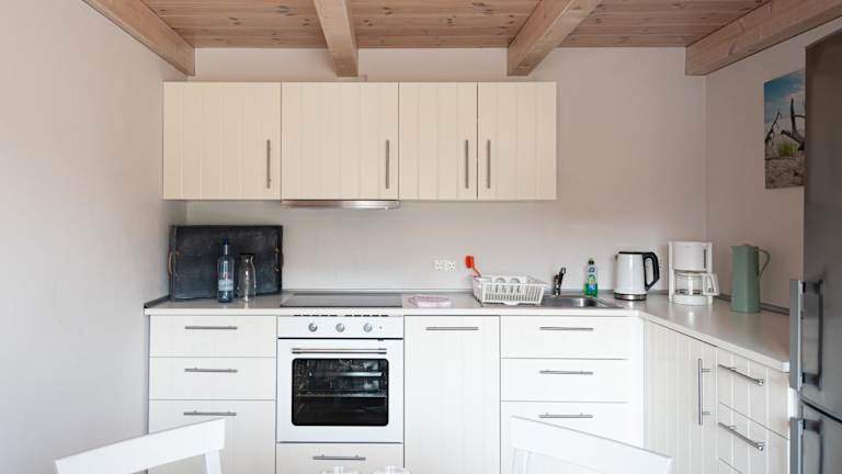 Die Unterkunft ist mit einer voll ausgestatteten Küche ausgestattet, die einen Kühlschrank, einen Ofen, eine Herdplatte, eine Kaffeemaschine und einen Wasserkocher umfasst.
