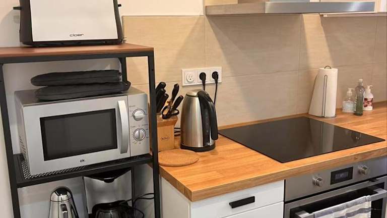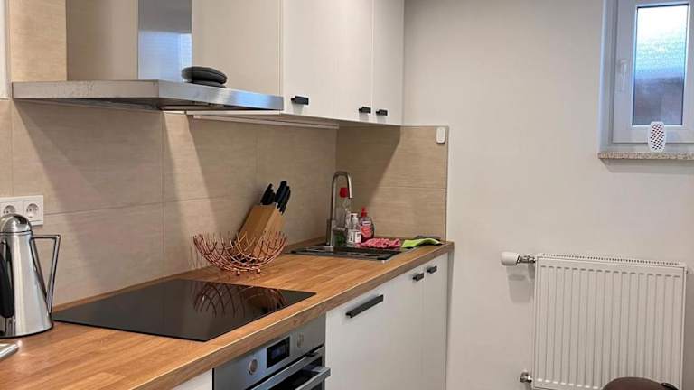 Die Ferienwohnung verfügt über eine voll ausgestattete Küche mit Kühlschrank, Geschirrspüler und Ofen. Es sind ein Essbereich sowie ein Badezimmer mit Dusche vorhanden. Handtücher und Bettwäsche werden bereitgestellt. Die Unterkunft bietet auch Nichtraucherzimmer und familienfreundliche Optionen.