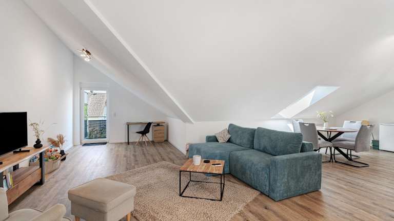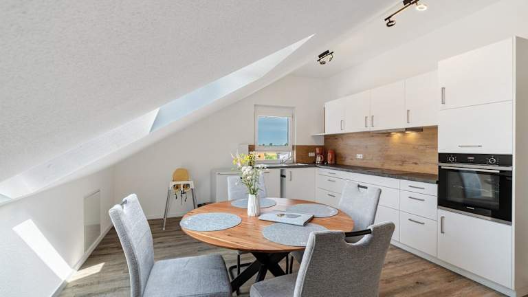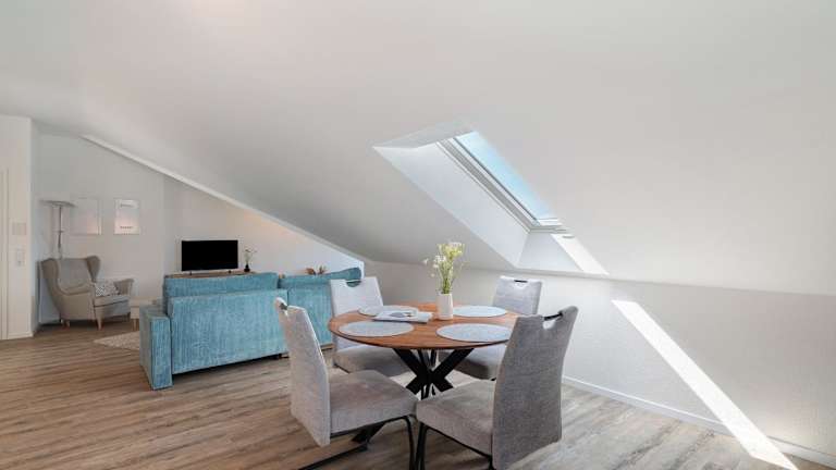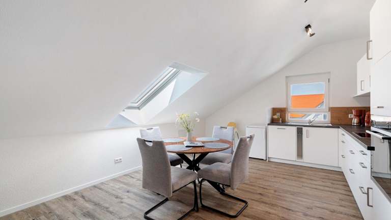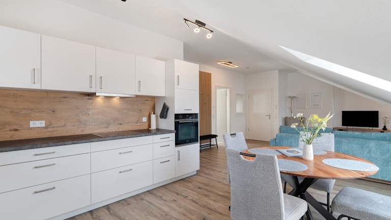 Die Ferienwohnung beinhaltet ein Schlafzimmer, ein Wohnzimmer, einen TV sowie eine gut ausgestattete Küche, die mit einem Kühlschrank und einem Geschirrspüler ausgestattet ist. Es gibt ein Badezimmer mit Dusche. Handtücher und Bettwäsche werden bereitgestellt.