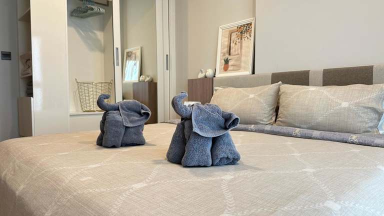 Die Ferienwohnung umfasst zwei Schlafzimmer, ein Badezimmer, eine voll ausgestattete Küche und einen Essbereich. Zur Ausstattung gehören Bettwäsche, Handtücher, ein Flachbild-TV und eine Terrasse mit Aussicht auf die Berge. Zudem sind klimatisierte Nichtraucherzimmer verfügbar.