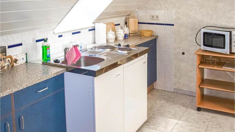 Die Ferienwohnung umfasst eine gut ausgestattete Küche, die mit einem Kühlschrank und einer Mikrowelle ausgestattet ist. Spezifische Informationen zu weiteren Verpflegungsmöglichkeiten sind nicht vorhanden.
