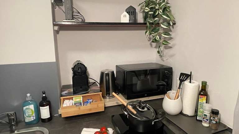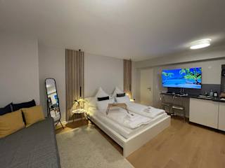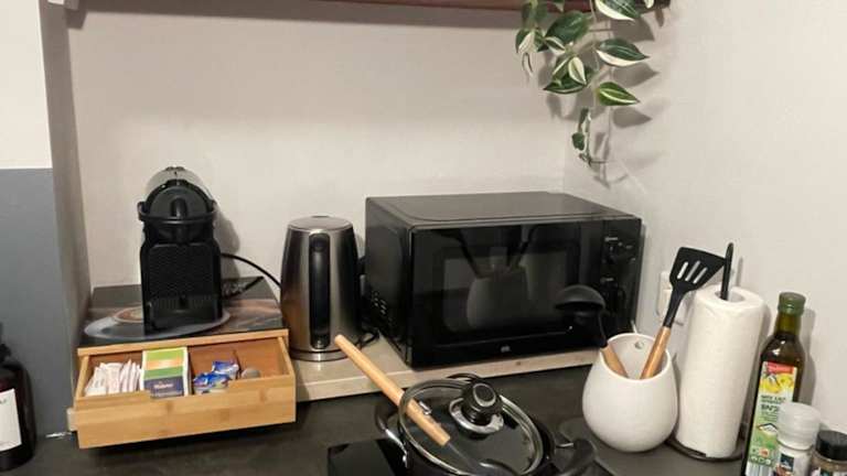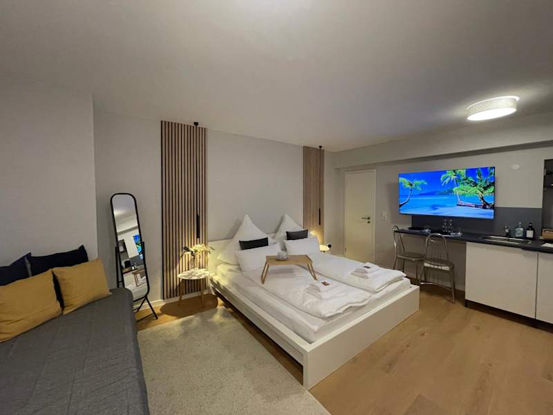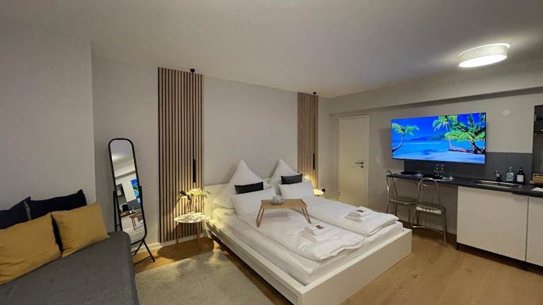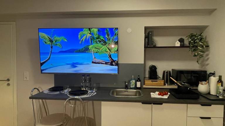 Die Ferienwohnung verfügt über ein Schlafzimmer und eine Küchenzeile, die mit Kühlschrank, Mikrowelle und Kaffeemaschine ausgestattet ist. Handtücher und Bettwäsche werden bereitgestellt. Die Unterkunft bietet Nichtraucherzimmer und Familienzimmer.