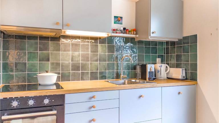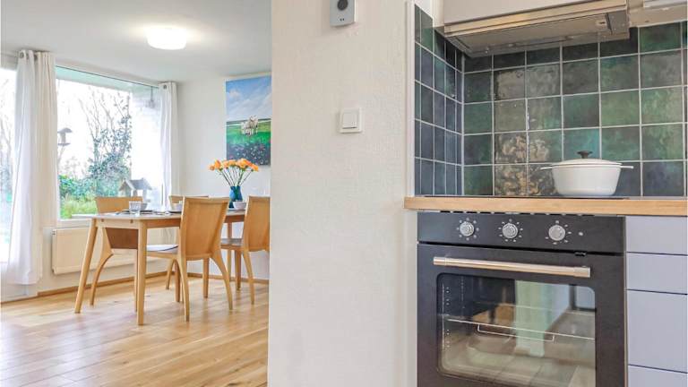 Die Ausstattung der Unterkunft umfasst eine gut ausgestattete Küche, die einen Kühlschrank, Geschirrspüler und Ofen beinhaltet, sowie einen Essbereich.