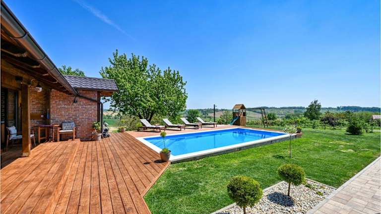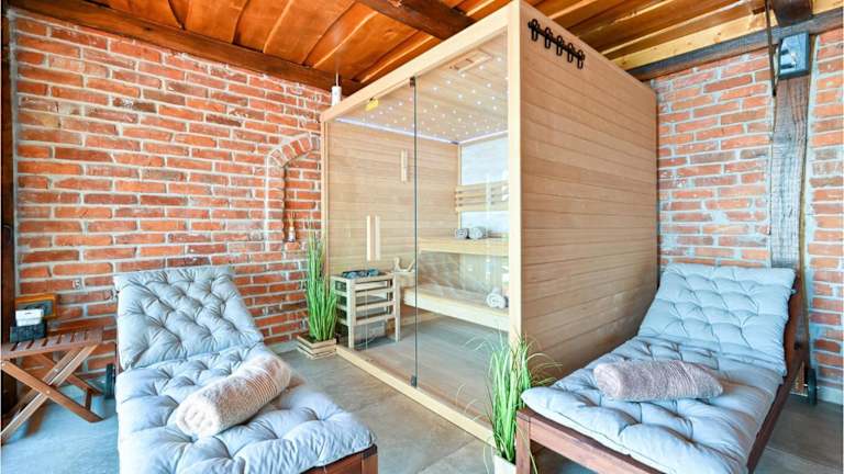 Das Freizeitangebot umfasst einen Außenpool, eine Sonnenterrasse, Angeln, Badminton und Outdoor-Spielgeräte für Kinder. Der Wellnessbereich bietet eine Sauna und einen Whirlpool, was zur Entspannung der Gäste beiträgt.