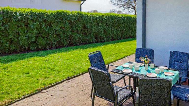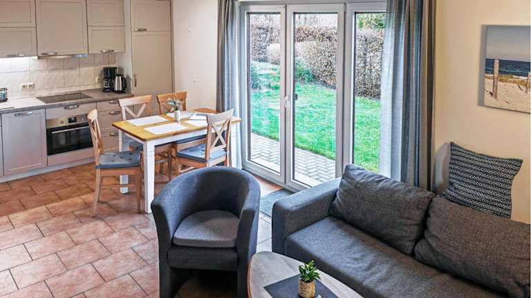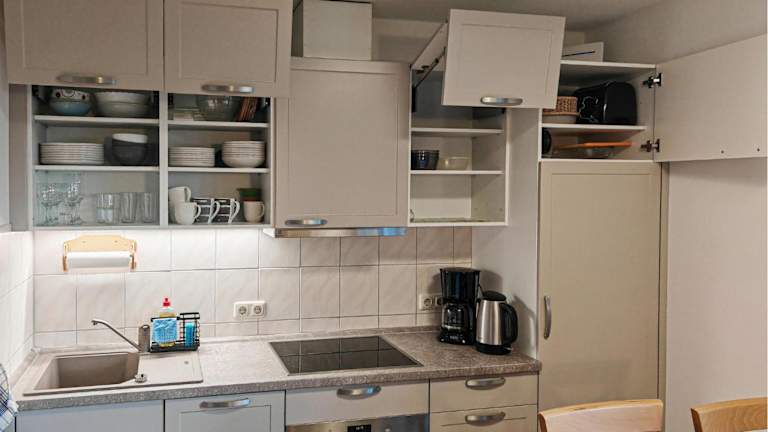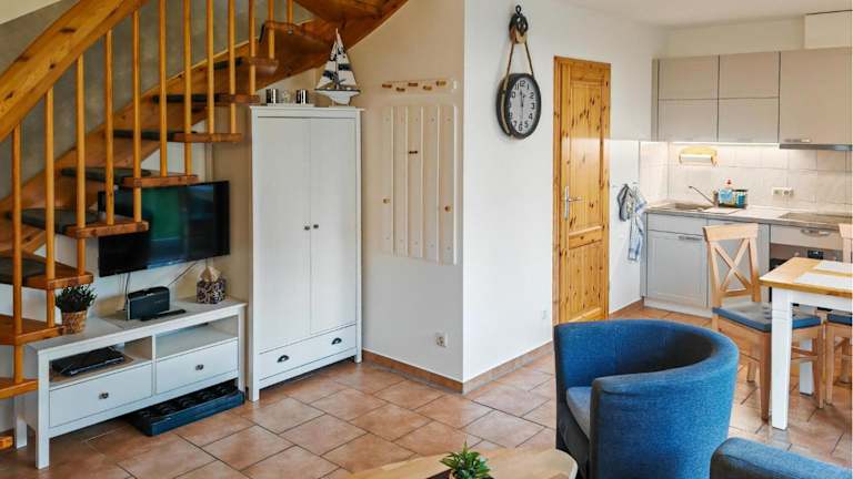 Das Ferienhaus besteht aus zwei Schlafzimmern und einem Wohnzimmer. Es ist mit einer voll ausgestatteten Küche ausgestattet, die über einen Kühlschrank und einen Geschirrspüler verfügt.