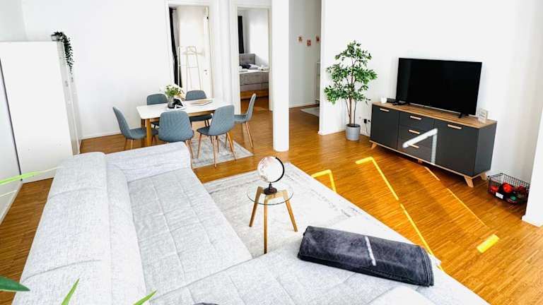 Die Ferienwohnung umfasst drei Schlafzimmer und zwei Badezimmer. Zur Ausstattung gehören Bettwäsche, Handtücher, ein Flachbild-TV, ein Essbereich sowie eine voll ausgestattete Küche. Eine Terrasse mit Stadtblick ist ebenfalls vorhanden. Zusätzlich stehen schallisolierte Zimmer und allergikerfreundliche Zimmer zur Verfügung.