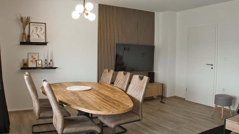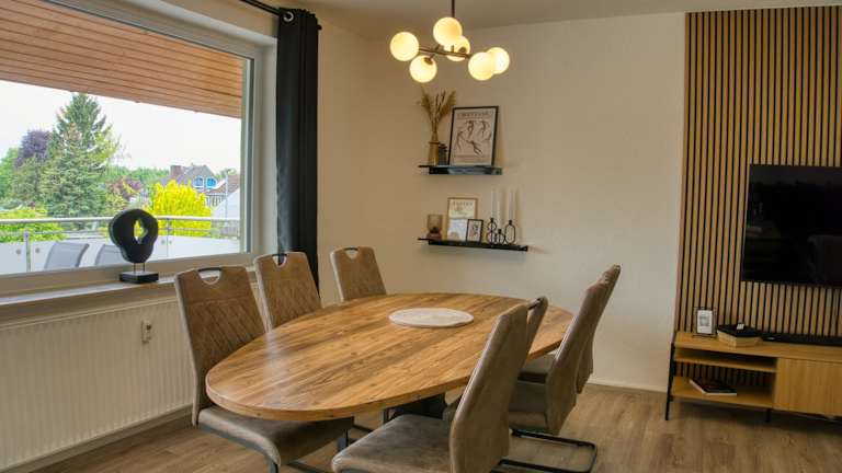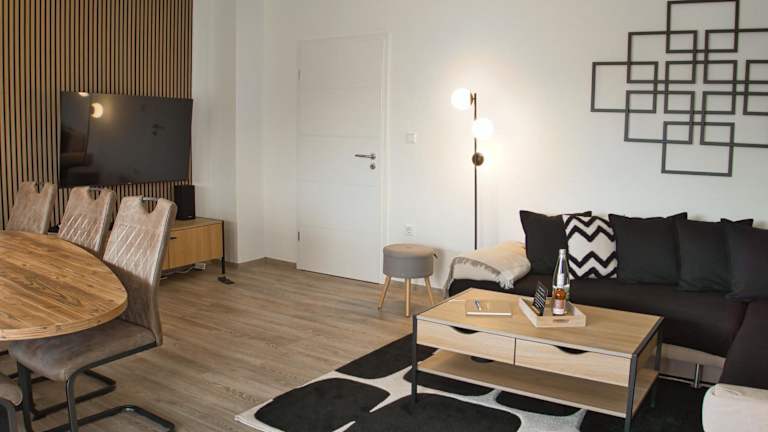 Die Ferienwohnung umfasst zwei Schlafzimmer, ein Wohnzimmer, eine voll ausgestattete Küche mit Kühlschrank und Kaffeemaschine sowie ein Badezimmer mit Dusche und Haartrockner. Handtücher und Bettwäsche werden bereitgestellt.