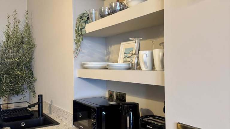 Die Unterkunft beinhaltet eine Küche, die mit einem Kühlschrank, einem Ofen, einer Mikrowelle, einem Toaster, einer Kaffeemaschine und einem Wasserkocher ausgestattet ist.