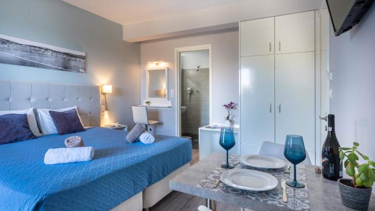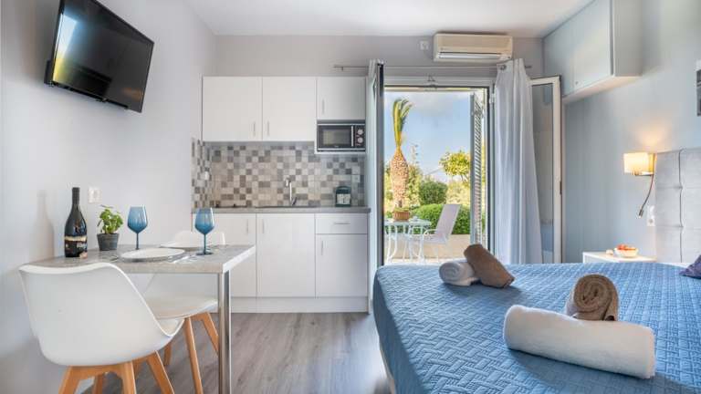 Die klimatisierten Apartments im Hotel Nondas verfügen über kostenfreies WLAN und bieten Ihnen einen komfortablen Aufenthalt. Jedes Apartment verfügt über eine Küchenzeile mit Mikrowelle, Wasserkocher und Kaffeemaschine, so dass Sie sich auch selbst verpflegen können. Von Ihrem möblierten Balkon oder Ihrer Terrasse aus haben Sie einen atemberaubenden Blick auf das Ionische Meer oder den gepflegten Garten. Zur weiteren Ausstattung gehören Sat-TV und eine Sonnenterrasse, auf der Sie sich entspannen können.