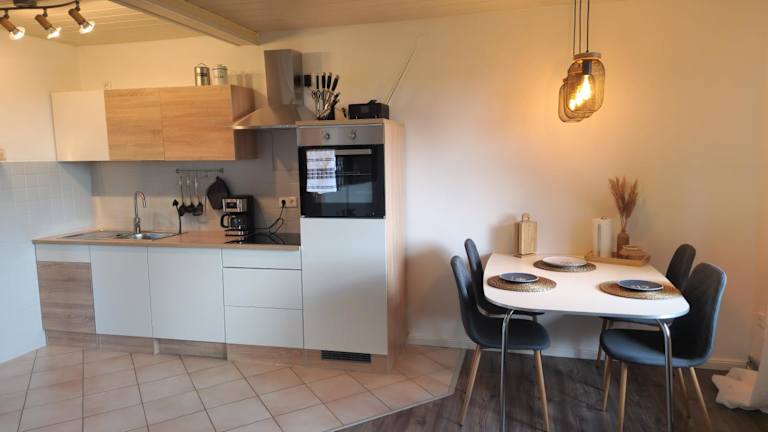 Die Ferienwohnung umfasst ein Schlafzimmer und ist mit einer Küche ausgestattet, die einen Kühlschrank und einen Geschirrspüler beinhaltet. Des Weiteren stehen ein Flachbild-TV, ein Sitzbereich und ein Badezimmer mit Dusche zur Verfügung. Handtücher und Bettwäsche werden bereitgestellt.