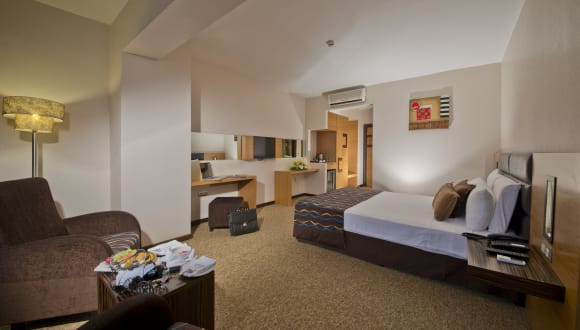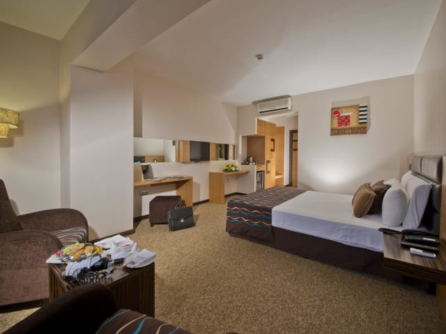 Das Hotel verfügt über insgesamt 95 Zimmer, darunter 10 Suiten und 84 Doppelzimmer, die sich auf 6 Etagen verteilen und bequem mit einem Aufzug erreichbar sind. Die Zimmer bieten modernen Komfort mit Klimaanlage, Heizung, Safe, Kaffee- und Teezubereitungsmöglichkeiten, Minibar und kostenfreiem WLAN. Die Badezimmer sind mit einer Dusche, einer Badewanne und einer Whirlwanne ausgestattet. Es stehen rollstuhlgerechte Zimmer mit barrierefreien Badezimmern zur Verfügung.